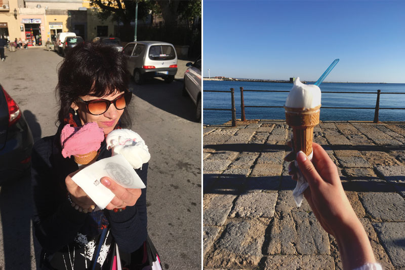 Tada balandį mus lepino gerų 22 laipsnių šiluma. Mes neieškojom istorijos ir po pažastimi nesinešėm žemėlapių, keliavom siauromis ir banguotomis Eričės gatvelėmis ir gaudėm vietinių gyvenimą. Čia – krautuvėlės turistams, o kavinės ir desertinės paruoštos smaližiams. Ir mes užsukom į ledainę, o ten žavus senukas, jau gerų 70-ties metų, šūkteli: „Gelato, Granita con Brioche?“. „Ne ne, ne ne ne“ – atsakėm šypsodamosios. „Tai gal manęs?“, - žavia italų kalba išbėrė džentelmenas. „Žinoma“, - atsakiau ir priėjau jį apkabinti. Laimės nenusipirksi. Bet mes galim pasidalinti sava šiluma ir gauti jos dvigubai atgal .
