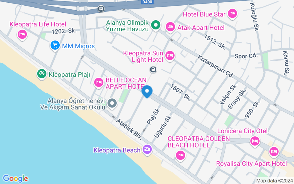 Viešbutis „Hedef Kleopatra Golden Sun“ yra už 120 km nuo Antalijos tarptautinio oro uosto ir už 45 km nuo Alanijos Gazipašos oro uosto.