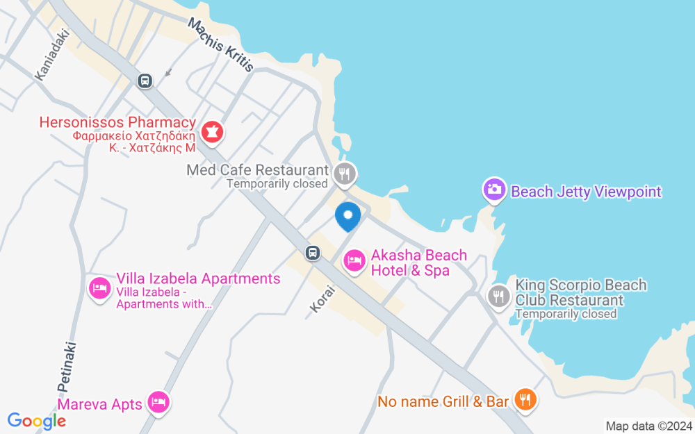 The hotel is located in the heart of Hersonissos. The hotel has a swimming pool, a restaurant, a bar and a spacious terrace overlooking the sea. The hotel's specialized team offers services for organizing weddings and other celebrations. There is a playground for children. With its convenient location near the beaches of Glaros, Golden Beach and Star Beach, as well as close to Heraklion Airport, this hotel is a good choice for a holiday in Crete.