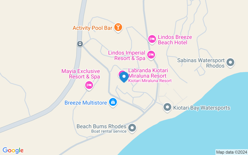 Apie 62 km iki oro uosto, apie 60 km iki Rodo miesto centro, apie 15 km iki Lindos, apie 1,5 km iki Kiotari centro, ant kalvos, apie 500 m iki paplūdimio. Autobusų stotelė priešais viešbutį. Vakaro pramogos: Kiotari miestelyje (apie 1,5 km).